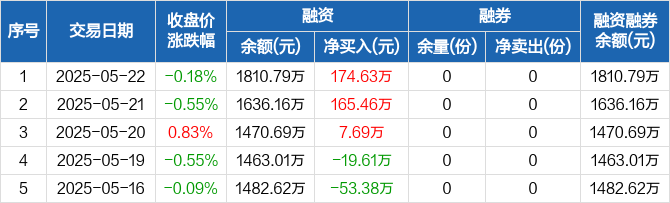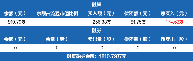 融资方面,当日融资买入256.38万元,融资偿还81.75万元,融资净买入174.63万元,连续3日净买入累计347.78万元。融券方面,融券卖出0份,融券偿还0份,融券余量0份,融券余额0元。融资融券余额合计1810.79万元。