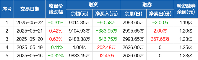 融资方面,当日融资买入1269.68万元,融资偿还1360.26万元,融资净偿还90.58万元,连续3日净偿还累计1021.28万元。融券方面,融券卖出0份,融券偿还2万份,融券余量2993.65万份,融券余额2852.95万元。融资融券余额合计1.19亿元。