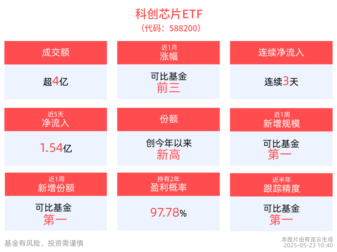 流动性方面,科创芯片ETF盘中换手1.76%,成交4.33亿元。拉长时间看,截至5月22日,科创芯片ETF近1年日均成交22.31亿元,排名可比基金第一。