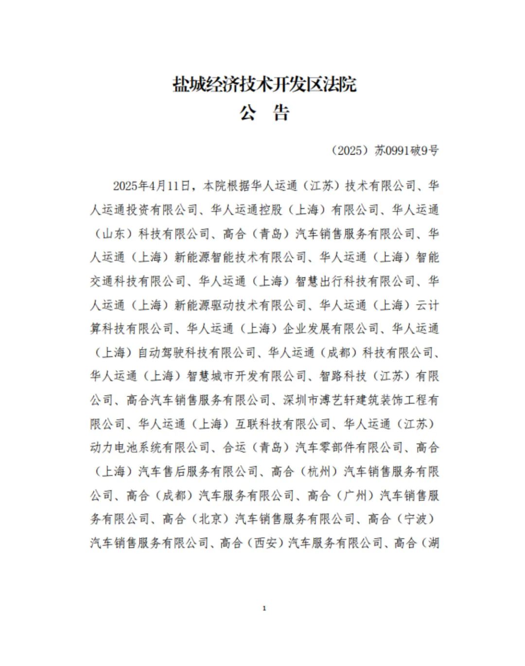“华人运通管理人”公众号发布的盐城经济技术开发区法院公告