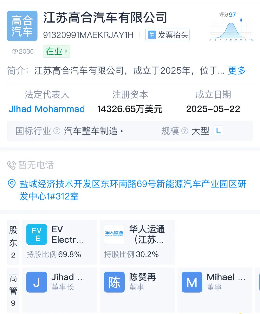 天眼查App显示,5月22日,江苏高合汽车有限公司成立,法定代表人和董事长为Jihad Mohammad,注册资本约1.43亿美元,经营范围包括道路机动车辆生产、汽车零部件研发、工程和技术研究和试验发展等,由EV Electra和华人运通共同持股。华人运通持股30.2%,EV Electra持股69.8%。