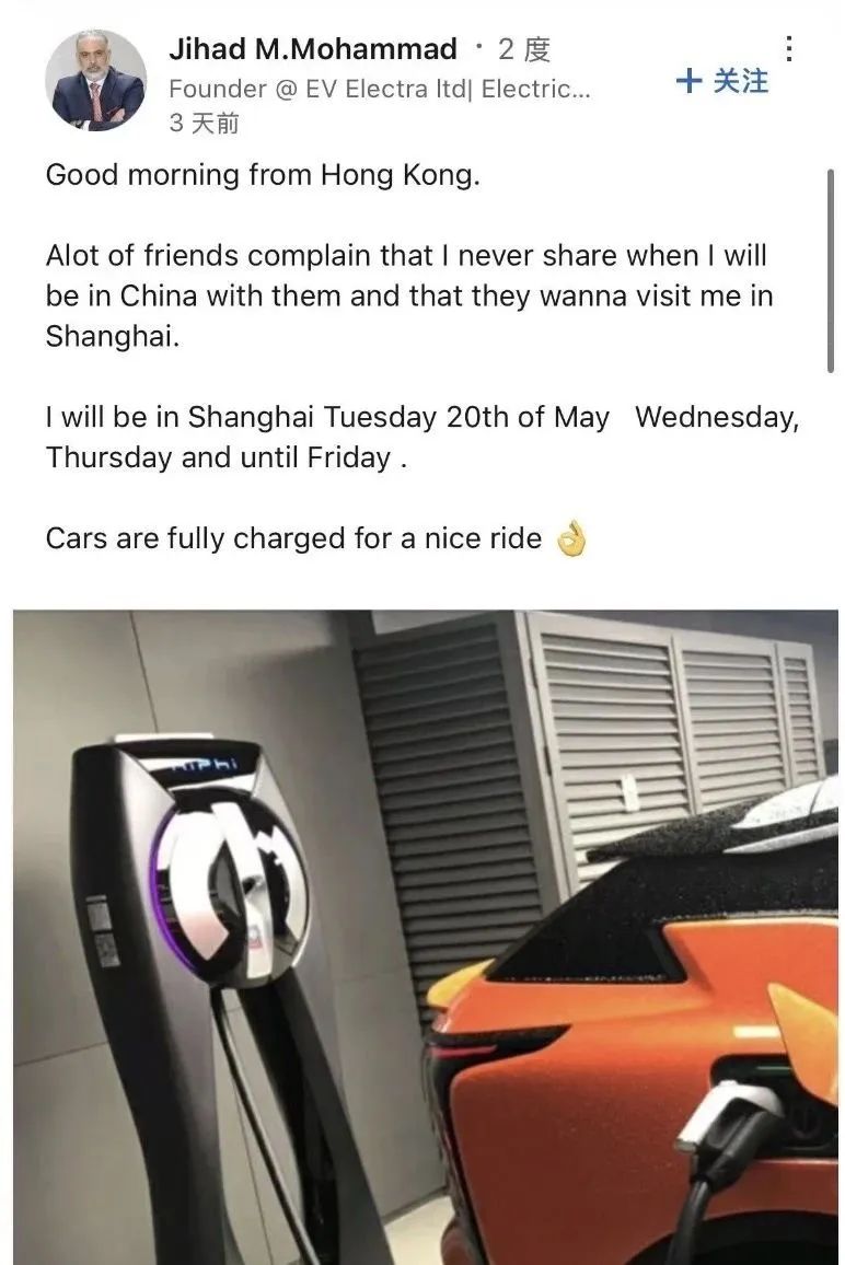 作为EV Electra的创始人,Jihad Mohammad日前在社交平台上表示将于5月20日到访上海,配图为高合汽车。另外,在EV Electra的官网上,高合汽车的三款车型已出现在首页。