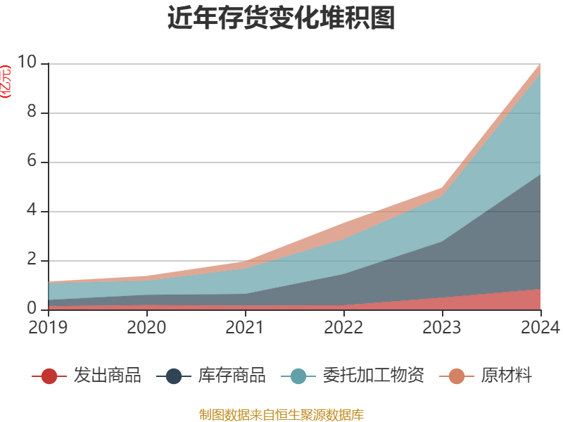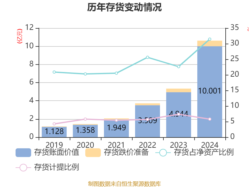 从存货变动来看,截至2024年末,公司存货账面价值为10亿元,占净资产的31.44%,较上年末增加5.06亿元。其中,存货跌价准备为6134.21万元,计提比例为5.78%。