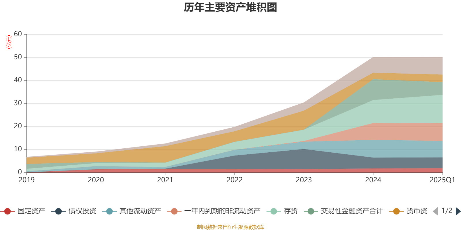 资产重大变化方面,截至2025年一季度末,公司交易性金融资产合计较上年末减少38.85%,占公司总资产比重下降7.01个百分点;存货较上年末增加23.67%,占公司总资产比重上升4.68个百分点;预付款项较上年末增加451.2%,占公司总资产比重上升1.75个百分点;其他流动资产较上年末减少7.47%,占公司总资产比重下降1.17个百分点。
