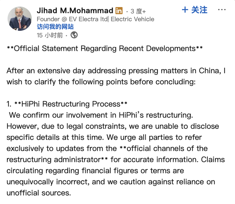 传闻不断背后,Jihad Mohammad 5月22日深夜在其个人社交账号上发文称,确认参与了HiPhi(高合)的重整工作。“然而,由于法律限制,我们无法在此披露具体细节。我们敦促所有各方仅参考重整管理人官方渠道发布的更新以获取准确信息。关于财务数字或条款的流传说法明显是不准确的,我们警告不要依赖非官方来源。”