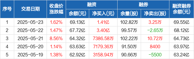 融资方面,当日融资买入8亿元,融资偿还6.58亿元,融资净买入1.41亿元,净买入额两市排名第七,连续5日净买入累计6.58亿元。融券方面,融券卖出4.22万股,融券偿还9700股,融券余量102.82万股,融券余额4196.08万元。融资融券余额合计69.55亿元。