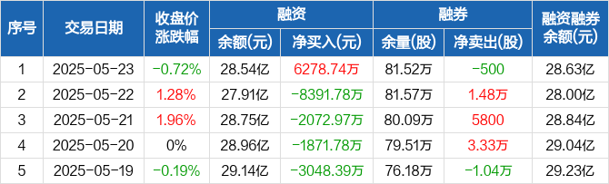 融资方面,当日融资买入1.49亿元,融资偿还8576.12万元,融资净买入6278.74万元,净买入额两市排名第17。融券方面,融券卖出0股,融券偿还500股,融券余量81.52万股,融券余额895.09万元。融资融券余额合计28.63亿元。