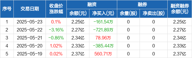 融资方面,当日融资买入708.67万元,融资偿还870.21万元,融资净偿还161.54万元。融券方面,融券卖出0股,融券偿还0股,融券余量0股,融券余额0元。融资融券余额合计2.25亿元。