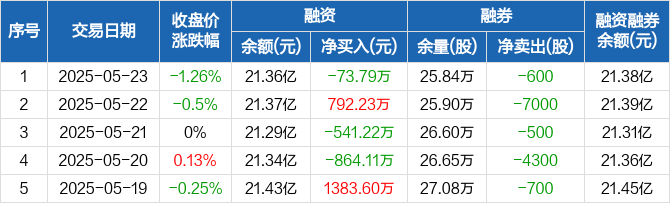 融资方面,当日融资买入2678.62万元,融资偿还2752.4万元,融资净偿还73.79万元。融券方面,融券卖出0股,融券偿还600股,融券余量25.84万股,融券余额202.84万元。融资融券余额合计21.38亿元。
