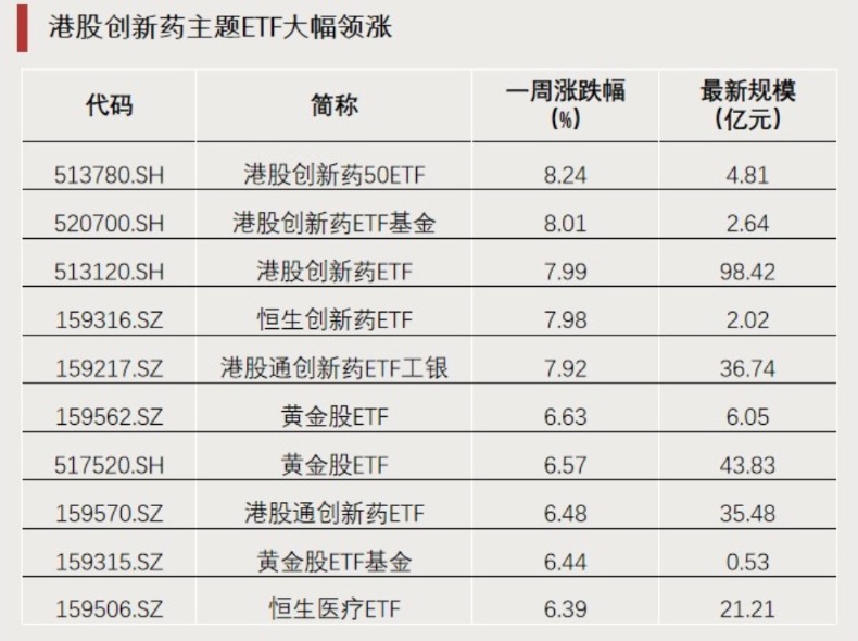 港股方面,创新药板块时隔一个月再度大涨。包括易方达基金旗下的恒生创新药ETF(159316)在内的多只港股创新药主题ETF,周涨幅均达8%左右,二级市场价格也创下今年以来新高。在此带动下,港股通医药ETF(513200)等多只港股医药主题ETF周涨幅也超过了4%。