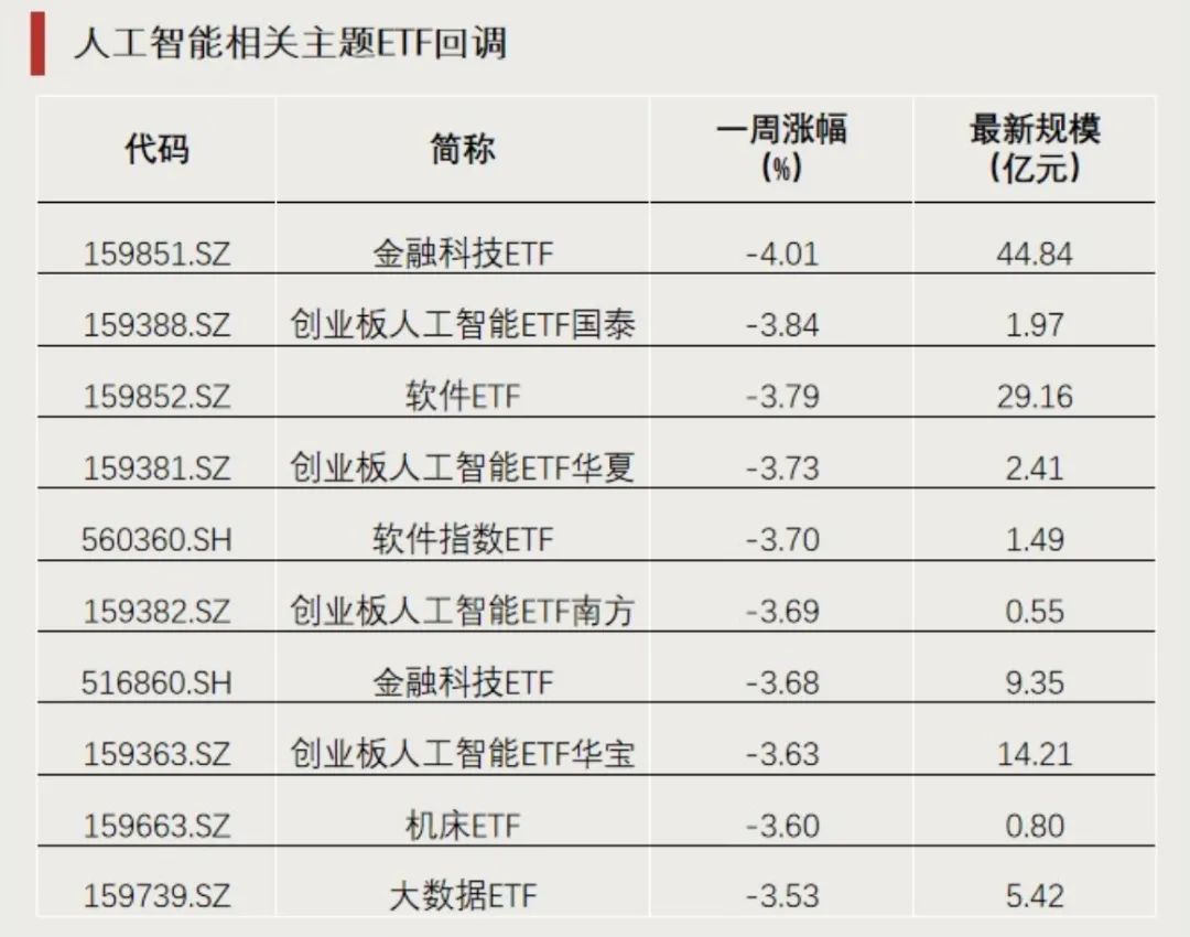 上周,A股人工智能产业链回调,软件、大数据、云计算等板块相关主题ETF跌超3%。此外,金融科技、机器人、机床、光伏等主题ETF也回调明显。