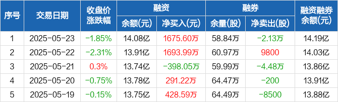 融资方面,当日融资买入9492.25万元,融资偿还7816.64万元,融资净买入1675.6万元。融券方面,融券卖出2.01万股,融券偿还4.14万股,融券余量58.84万股,融券余额1125.61万元。融资融券余额合计14.19亿元。
