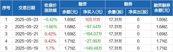 融资方面,当日融资买入313.16万元,融资偿还210.05万元,融资净买入103.11万元。融券方面,融券卖出0股,融券偿还0股,融券余量17.31万股,融券余额40.85万元。融资融券余额合计1.69亿元。