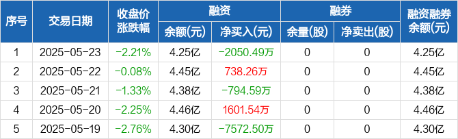 融资方面,当日融资买入6158.5万元,融资偿还8208.99万元,融资净偿还2050.49万元。融券方面,融券卖出0股,融券偿还0股,融券余量0股,融券余额0元。融资融券余额合计4.25亿元。