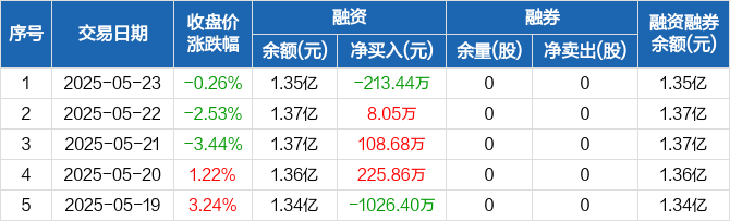 融资方面,当日融资买入714.77万元,融资偿还928.21万元,融资净偿还213.44万元。融券方面,融券卖出0股,融券偿还0股,融券余量0股,融券余额0元。融资融券余额合计1.35亿元。
