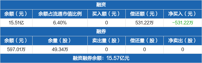 融资方面,当日融资买入0元,融资偿还531.22万元,融资净偿还531.22万元,连续11日净偿还累计7559.46万元。融券方面,融券卖出0股,融券偿还0股,融券余量49.34万股,融券余额597.01万元。融资融券余额合计15.57亿元。