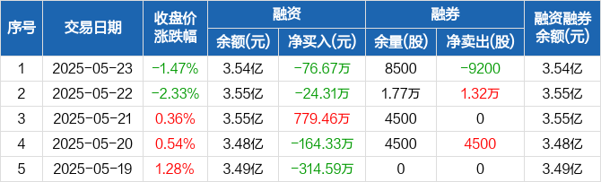 融资方面,当日融资买入557.31万元,融资偿还633.98万元,融资净偿还76.67万元。融券方面,融券卖出1300股,融券偿还1.05万股,融券余量8500股,融券余额4.56万元。融资融券余额合计3.54亿元。