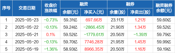 融资方面,当日融资买入1.41亿元,融资偿还1.34亿元,融资净买入697.66万元。融券方面,融券卖出2.72万股,融券偿还1.51万股,融券余量23.11万股,融券余额2961.87万元。融资融券余额合计59.6亿元。