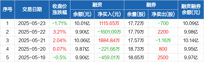 融资方面,当日融资买入8153.28万元,融资偿还7037.64万元,融资净买入1115.65万元。融券方面,融券卖出3100股,融券偿还3800股,融券余量17.72万股,融券余额762.49万元。融资融券余额合计10.09亿元。