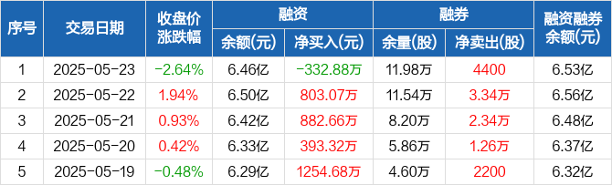 融资方面,当日融资买入6884.45万元,融资偿还7217.33万元,融资净偿还332.88万元。融券方面,融券卖出6640股,融券偿还2240股,融券余量11.98万股,融券余额667.87万元。融资融券余额合计6.53亿元。