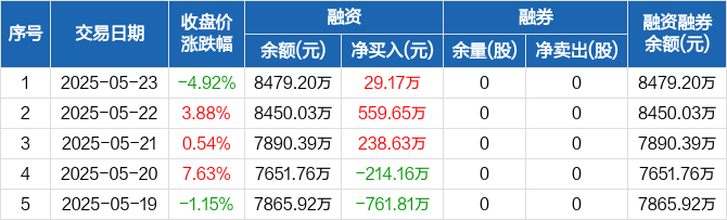 融资方面,当日融资买入1390.64万元,融资偿还1361.47万元,融资净买入29.17万元,连续3日净买入累计827.44万元。融券方面,融券卖出0股,融券偿还0股,融券余量0股,融券余额0元。融资融券余额合计8479.2万元。