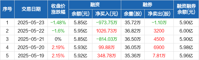 融资方面,当日融资买入1672.11万元,融资偿还2645.86万元,融资净偿还973.75万元。融券方面,融券卖出1800股,融券偿还1.28万股,融券余量35.72万股,融券余额453.29万元。融资融券余额合计5.9亿元。