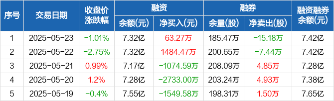 融资方面,当日融资买入3196.92万元,融资偿还3133.65万元,融资净买入63.27万元。融券方面,融券卖出1300股,融券偿还15.31万股,融券余量185.47万股,融券余额908.8万元。融资融券余额合计7.42亿元。