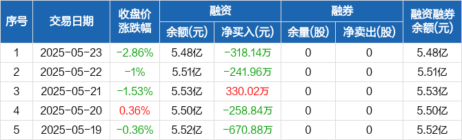 融资方面,当日融资买入1145.08万元,融资偿还1463.21万元,融资净偿还318.14万元。融券方面,融券卖出0股,融券偿还0股,融券余量0股,融券余额0元。融资融券余额合计5.48亿元。
