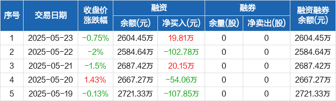 融资方面,当日融资买入359.52万元,融资偿还339.71万元,融资净买入19.81万元。融券方面,融券卖出0股,融券偿还0股,融券余量0股,融券余额0元。融资融券余额合计2604.45万元。