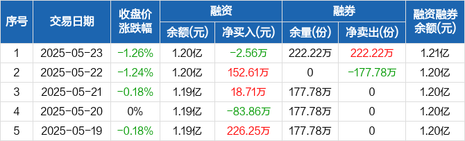 融资方面,当日融资买入816.32万元,融资偿还818.88万元,融资净偿还2.56万元。融券方面,融券卖出222.22万份,融券偿还0份,融券余量222.22万份,融券余额122万元。融资融券余额合计1.21亿元。