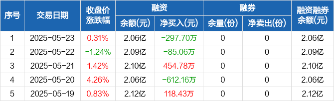 融资方面,当日融资买入4553.98万元,融资偿还4851.67万元,融资净偿还297.7万元。融券方面,融券卖出0份,融券偿还0份,融券余量0份,融券余额0元。融资融券余额合计2.06亿元。