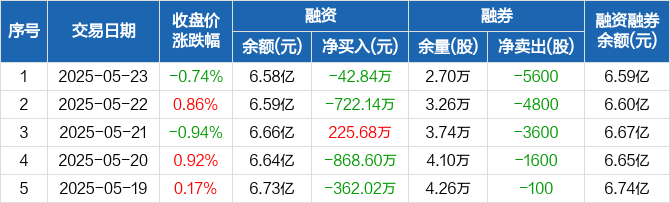 融资方面,当日融资买入1072.53万元,融资偿还1115.37万元,融资净偿还42.84万元。融券方面,融券卖出5400股,融券偿还1.1万股,融券余量2.7万股,融券余额94.07万元。融资融券余额合计6.59亿元。