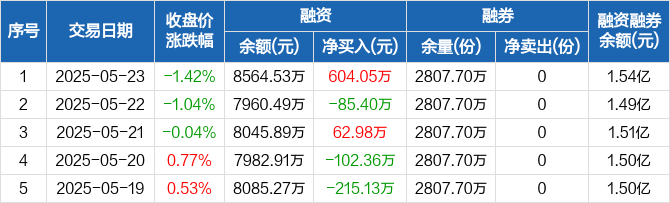 融资方面,当日融资买入891.72万元,融资偿还287.67万元,融资净买入604.05万元。融券方面,融券卖出0份,融券偿还0份,融券余量2807.7万份,融券余额6833.94万元。融资融券余额合计1.54亿元。