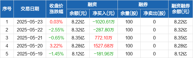 融资方面,当日融资买入2398.59万元,融资偿还3419.19万元,融资净偿还1020.61万元。融券方面,融券卖出0股,融券偿还0股,融券余量100股,融券余额2983元。融资融券余额合计8.22亿元。