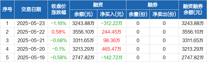融资方面,当日融资买入7210.61万元,融资偿还7522.83万元,融资净偿还312.22万元。融券方面,融券卖出0份,融券偿还0份,融券余量0份,融券余额0元。融资融券余额合计3243.88万元。