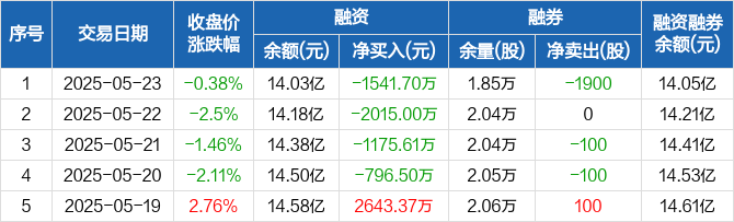 融资方面,当日融资买入3366.64万元,融资偿还4908.34万元,融资净偿还1541.7万元,连续4日净偿还累计5528.82万元。融券方面,融券卖出0股,融券偿还1900股,融券余量1.85万股,融券余额253.39万元。融资融券余额合计14.05亿元。