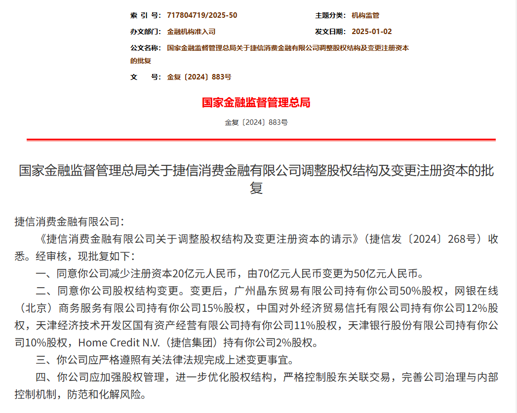 据此前公布的《国家金融监督管理总局关于捷信消费金融有限公司调整股权结构及变更注册资本的批复》,公司股权结构变更后,广州晶东贸易有限公司持有公司50%股权、网银在线(北京)商务服务有限公司持有公司15%的股权。以上两家持股主体均为京东集团旗下企业,合计持有京东消金65%的股份。