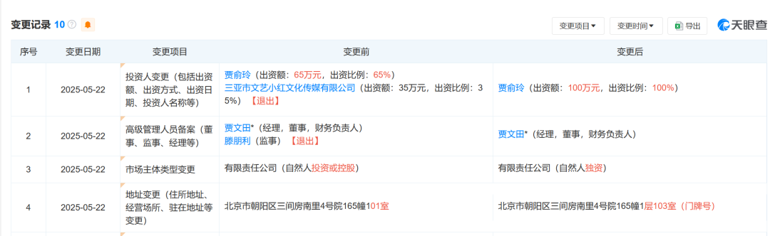天眼查APP显示,近日,北京大碗娱乐文化传媒有限公司发生工商变更,原股东三亚市文艺小红文化传媒有限公司退出,原公司监事卸任。目前,贾玲(本名贾俞玲)全资持股北京大碗娱乐,贾玲父亲贾文田担任该公司法定代表人、经理、董事以及财务负责人职务。