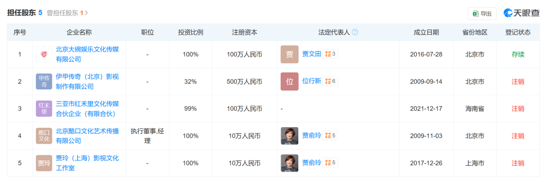 天眼查APP显示,贾玲名下关联企业有5家,其中仅大碗娱乐一家处于存续状态。贾玲(上海)影视文化工作室、北京酷口文化艺术传播公司、三亚市红禾里文化传媒合伙企业等四家企业均已注销。