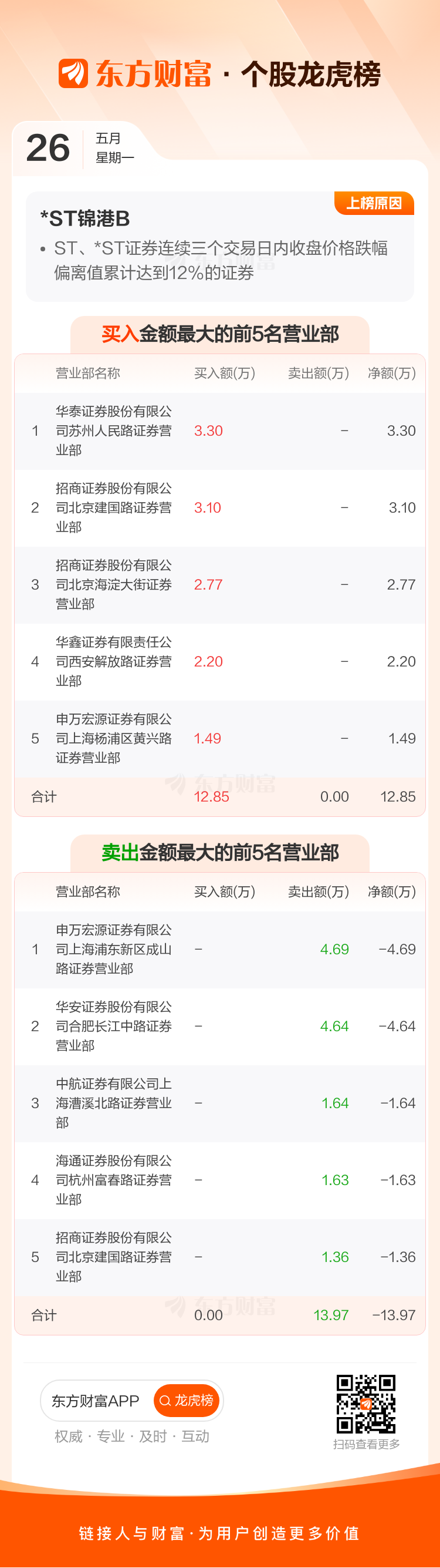 交易所2025年5月26日公布的交易公开信息显示,*ST锦港B因成为ST、*ST证券连续三个交易日内收盘价格跌幅偏离值累计达到12%的证券上榜。*ST锦港B当日收报0.044元,涨跌幅-4.35%,换手率0.44%,成交额31.06万。异常期间5月22日至5月26日,期间涨幅-13.73%,累计偏离值-13.19%,区间成交额46.21万。
