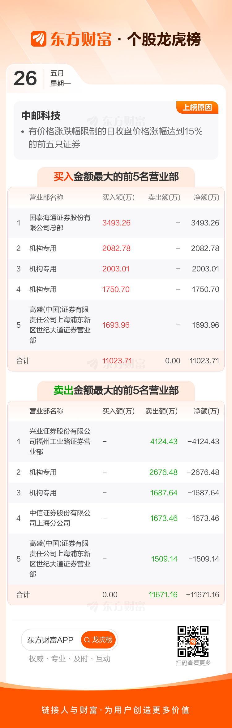 交易所2025年5月26日公布的交易公开信息显示,中邮科技因成为有价格涨跌幅限制的日收盘价格涨幅达到15%的前五只证券上榜。中邮科技当日收报55.2元,涨跌幅20.00%,偏离值20.00%,换手率19.26%,成交额6.71亿。
