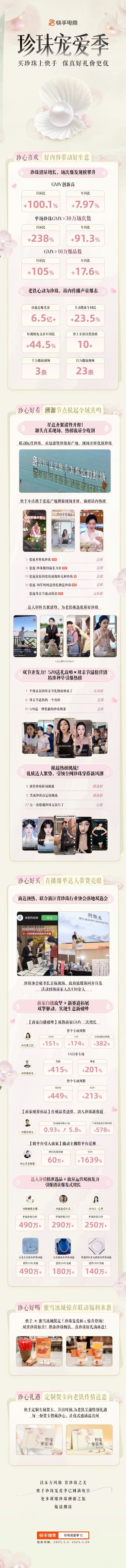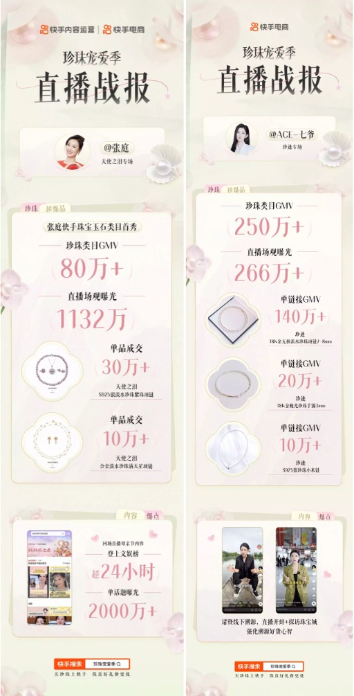 近日,“珍珠宠爱季——快手电商山下湖珍珠产业带官方溯源”活动圆满落幕。活动期间,快手电商携手山下湖镇人民政府,以“快手官方珍珠产地溯源”为核心,结合母亲节与520消费节点,通过“快手小店”及多位达人助推,让来自诸暨的优质珍珠产品走向更广阔的消费市场。快手主播@ACE-七爷、@张庭分别凭借250万+、80万+珍珠类目GMV,成为本次活动中表现亮眼的达人代表。