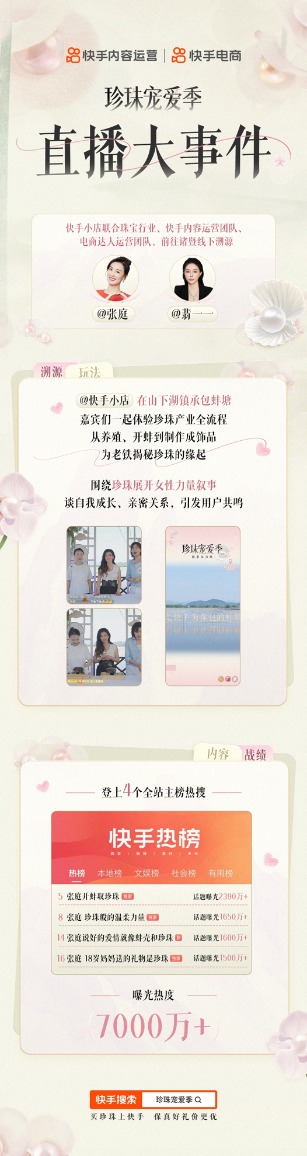 为了带更多消费者清晰地了解珍珠来源,进而赢得信任、促进转化,5月14日,快手小店联合珠宝玉石行业,携手@张庭、@翡一一前往浙江诸暨山下湖镇开启直播,探索一颗珍珠从孕育、采收到设计、加工的全流程。
