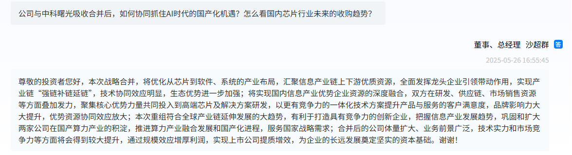 沙超群认为,本次重组符合全球产业链延伸发展的大趋势,有利于打造具有竞争力的创新企业,把握信息产业发展趋势,巩固和扩大两家公司在国产算力产业方面的积淀,推进算力产业融合发展和国产化发展进程,服务国家战略需求。