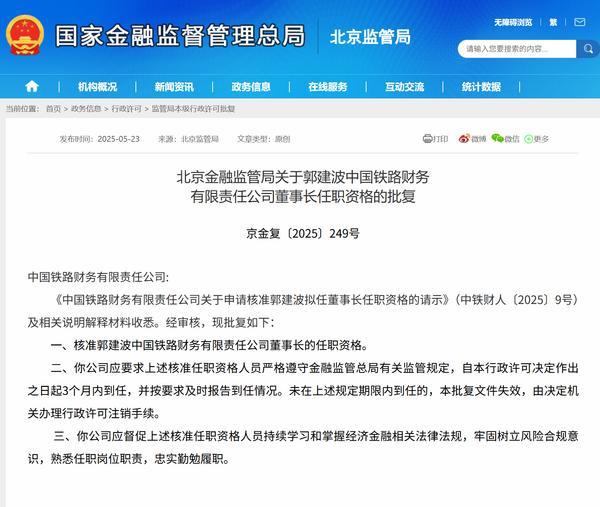 中国网财经5月26日讯日前,北京金融监管局公布相关批复信息,核准郭建波中国铁路财务有限责任公司(简称“中国铁路财务公司”)董事长的任职资格。以下是相关批复正文: