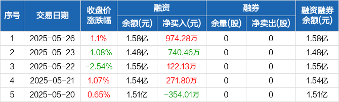 融资方面,当日融资买入1282万元,融资偿还307.72万元,融资净买入974.28万元。融券方面,融券卖出0股,融券偿还0股,融券余量0股,融券余额0元。融资融券余额合计1.58亿元。
