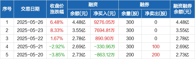融资方面,当日融资买入1.93亿元,融资偿还1.01亿元,融资净买入9276.05万元,净买入额创历史新高,净买入额两市排名第11,连续3日净买入累计1.79亿元。融券方面,融券卖出0股,融券偿还0股,融券余量300股,融券余额3156元。融资融券余额合计4.48亿元。