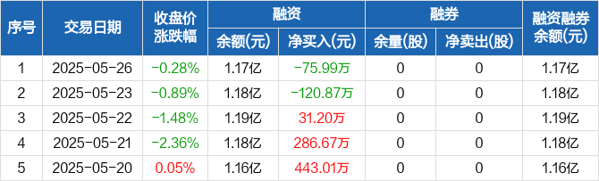 融资方面,当日融资买入230.9万元,融资偿还306.89万元,融资净偿还75.99万元。融券方面,融券卖出0股,融券偿还0股,融券余量0股,融券余额0元。融资融券余额合计1.17亿元。