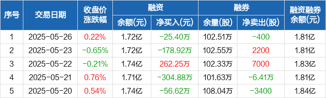 融资方面,当日融资买入396.78万元,融资偿还422.18万元,融资净偿还25.4万元。融券方面,融券卖出0股,融券偿还400股,融券余量102.51万股,融券余额949.24万元。融资融券余额合计1.81亿元。