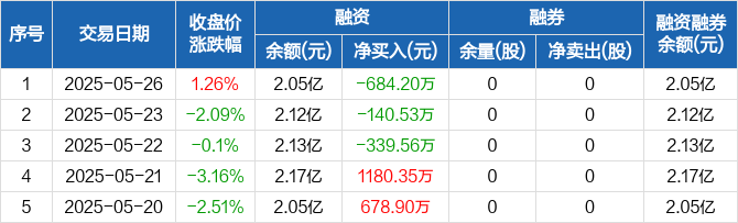 融资方面,当日融资买入776.04万元,融资偿还1460.24万元,融资净偿还684.2万元,连续3日净偿还累计1164.29万元。融券方面,融券卖出0股,融券偿还0股,融券余量0股,融券余额0元。融资融券余额合计2.05亿元。